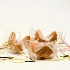 Approximately 3″ in diameter, our SMALL fortune cookies are larger than most fortune cookies. Wrapped in clear cellophane with a minimum order of 25 cookies.